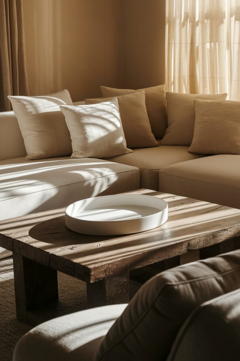 Use wooden trays on coffee tables or side tables to organize items like books and drinks. The contrast between soft pillows and hard trays adds visual interest.