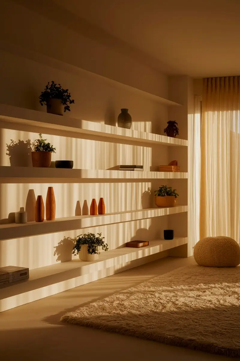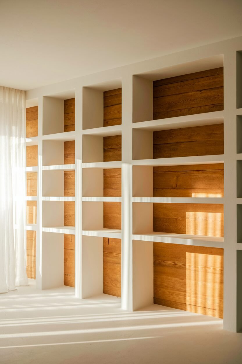 Decorate the shelves with wooden sculptures, books, or plants to create a balanced display. The white background helps the wood elements pop and become the focal point of the room.