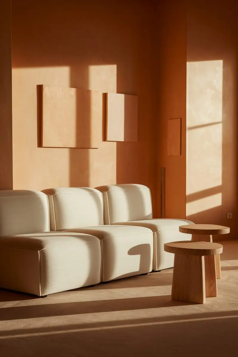 A white modular sofa paired with wooden side tables creates a modern and functional living room. This setup is perfect for accommodating guests and making the most of your space.