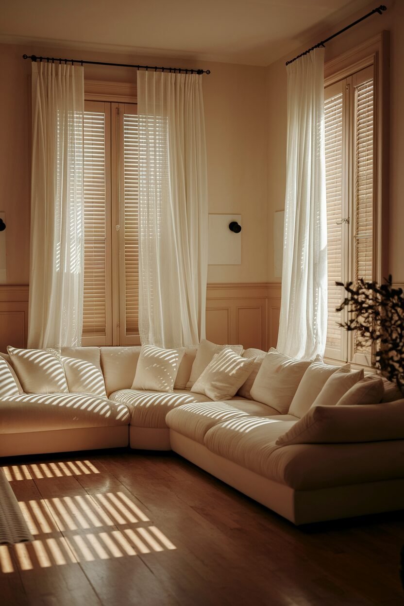 White curtains give a soft, airy feel, while wooden blinds add a touch of sophistication. This mix is perfect for creating a warm and inviting atmosphere.