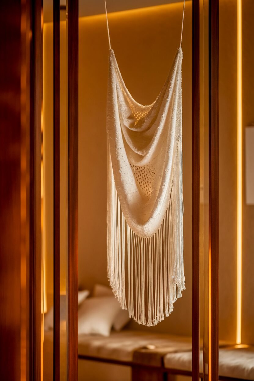 Hanging a white tapestry in a wooden frame can add an artistic touch to your living room. This combination creates a beautiful focal point while enhancing your decor.