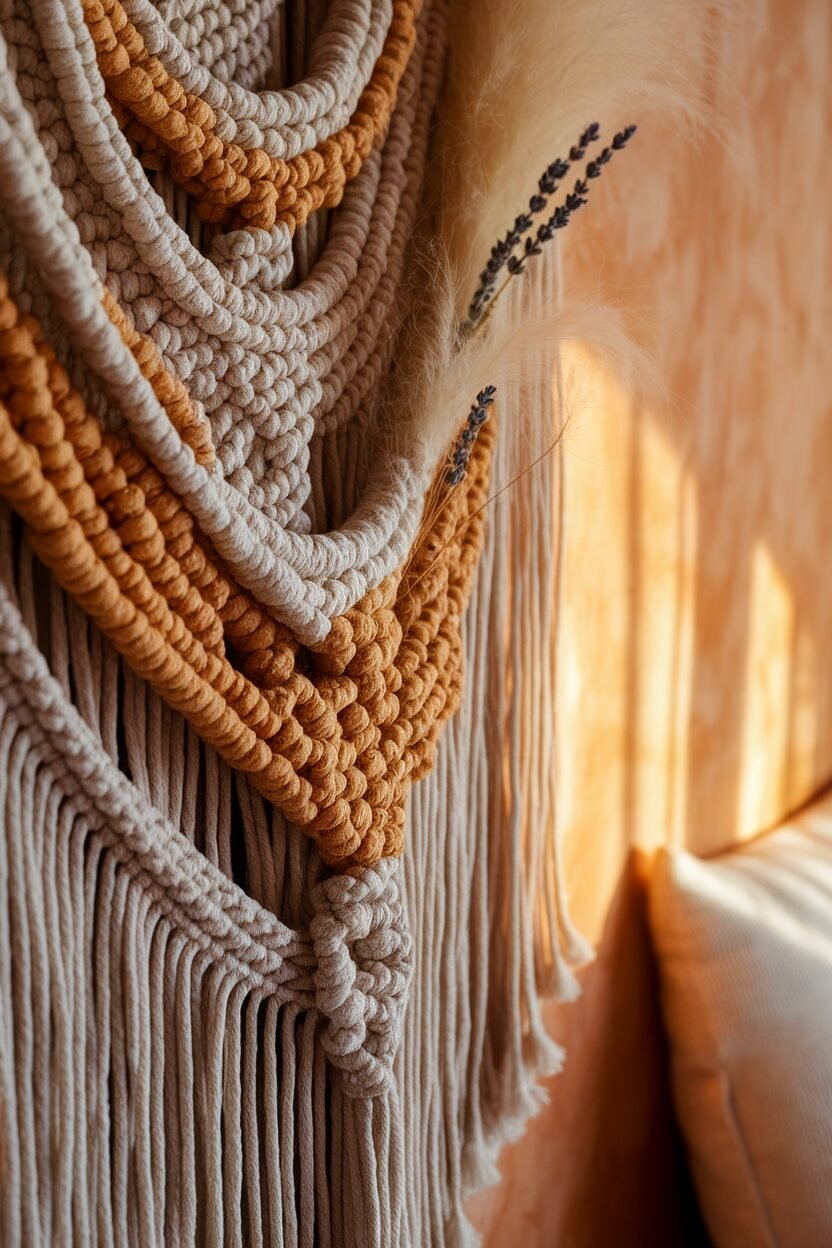 Layered macrame wall tapestries are all about drama and elegance. They add dimension and a tactile quality to your walls. This idea is perfect for those who love a bit of luxury.
