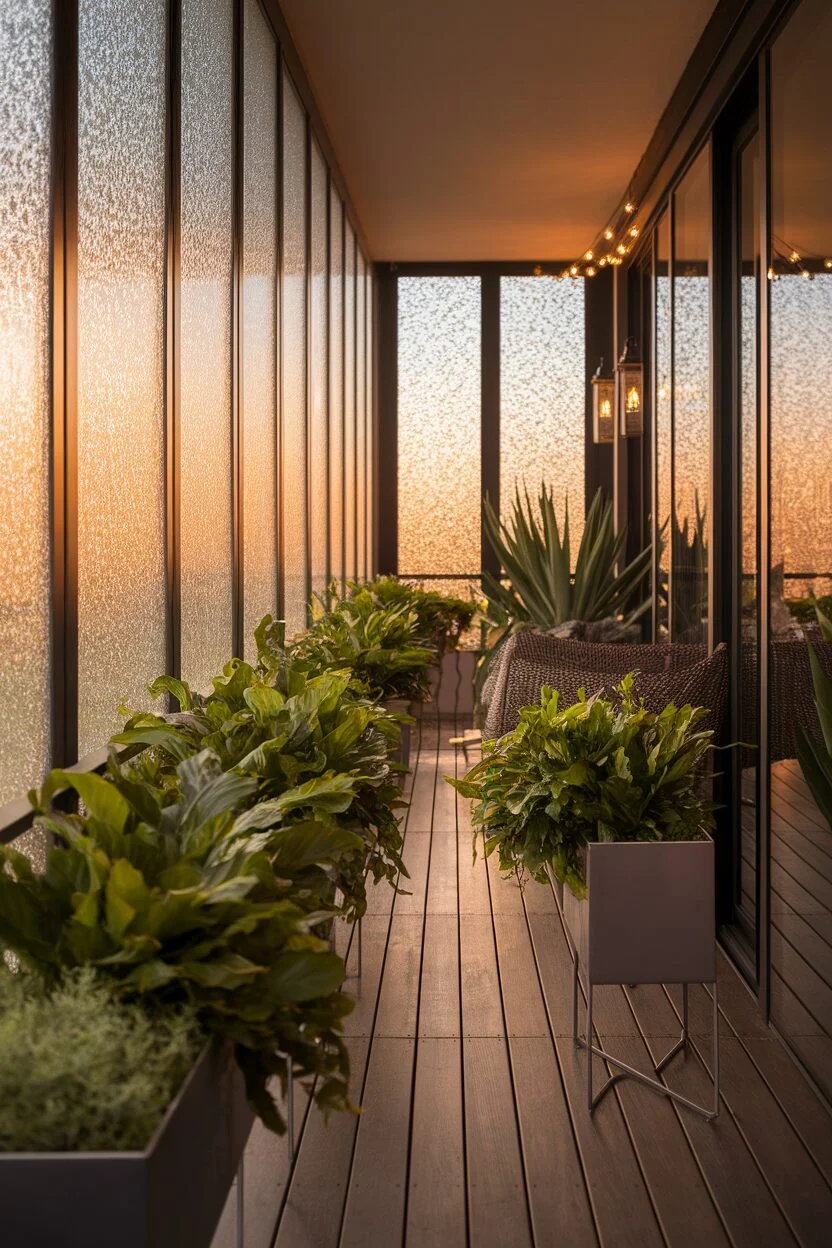 These panels come in various designs, such as frosted or tinted, giving you options for how much light and visibility you want. They also bring a contemporary touch to your balcony decor.