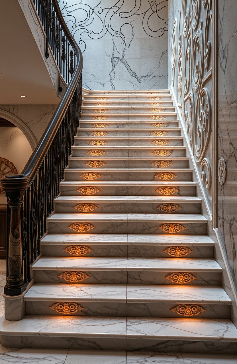 Imagine a marble staircase with LED-illuminated carvings, highlighting intricate designs. The lights add depth and dimension to the carvings.