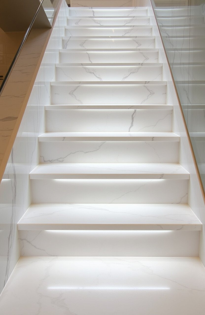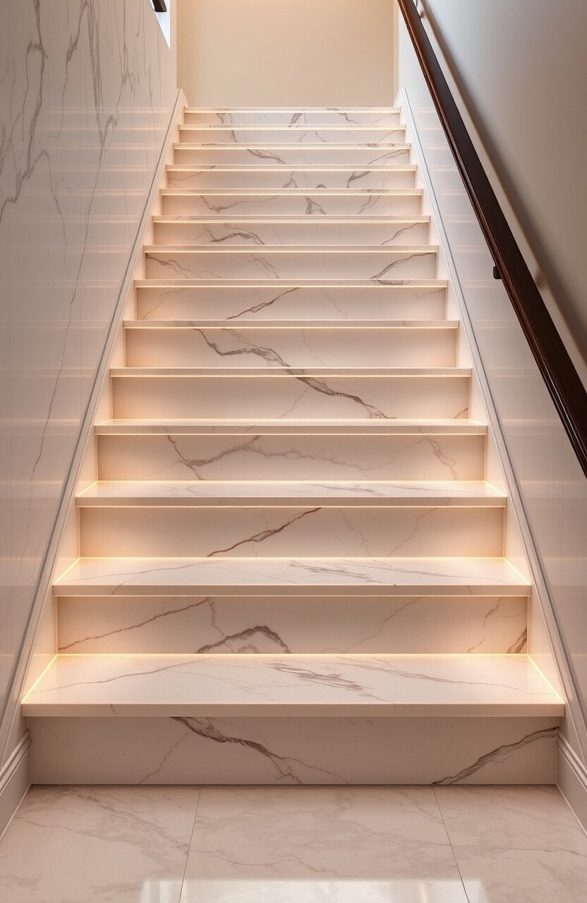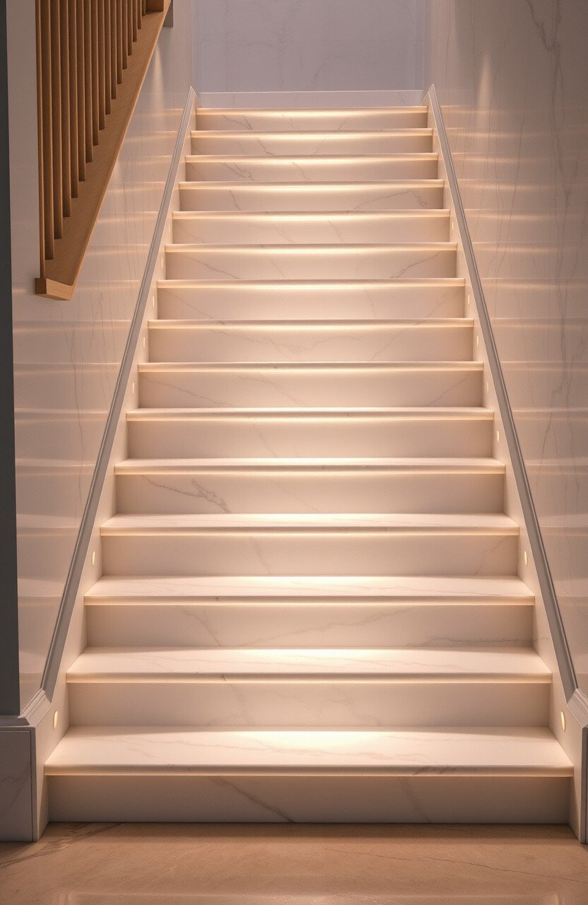 Imagine a marble staircase with LED-illuminated treads, providing subtle and effective lighting. The lights create a soft and even glow across each tread.