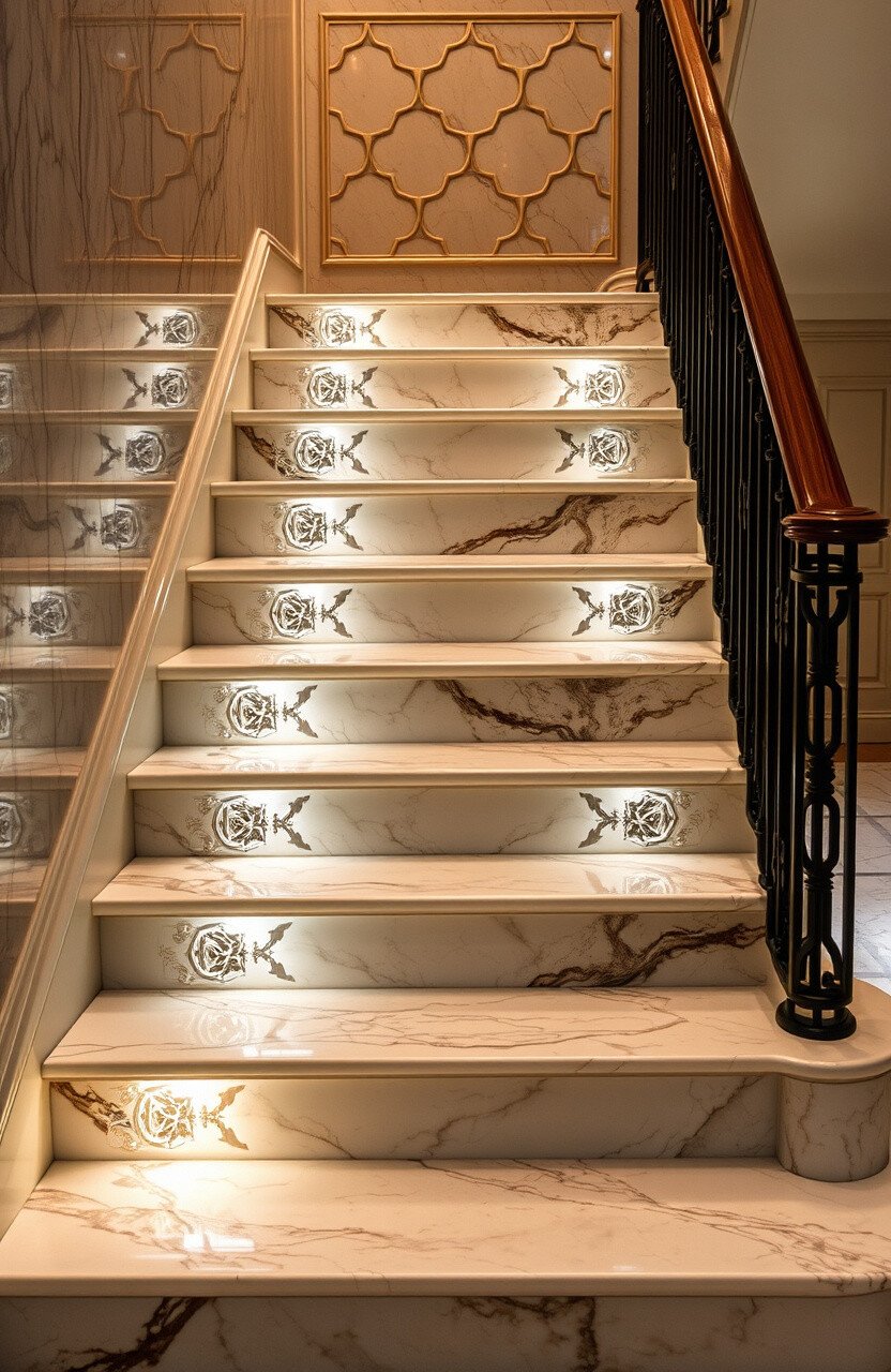 Imagine marble steps with LED-illuminated inlays, adding a touch of luxury and elegance. The lights highlight intricate designs within the marble.