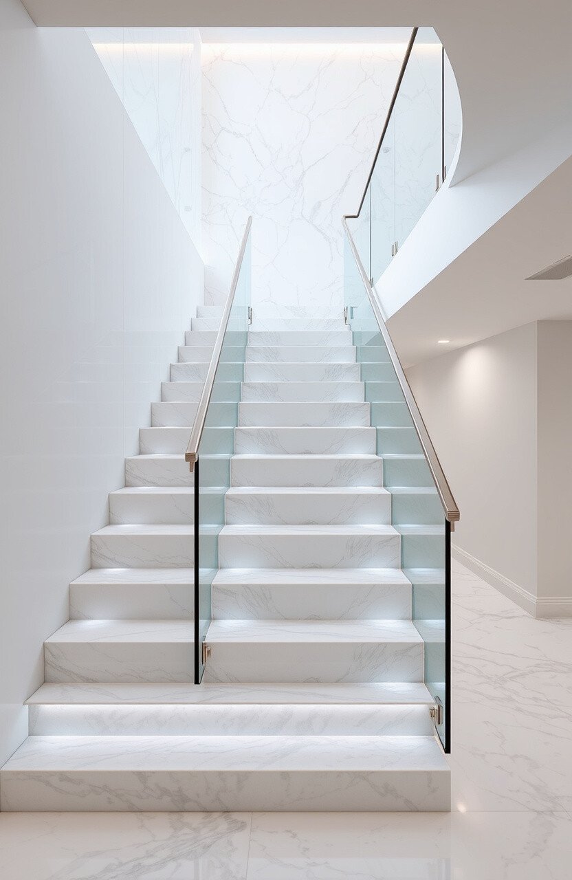 Step onto a marble and glass staircase with soft LED underlighting for a modern, airy feel. The glass adds transparency, while the marble provides stability.