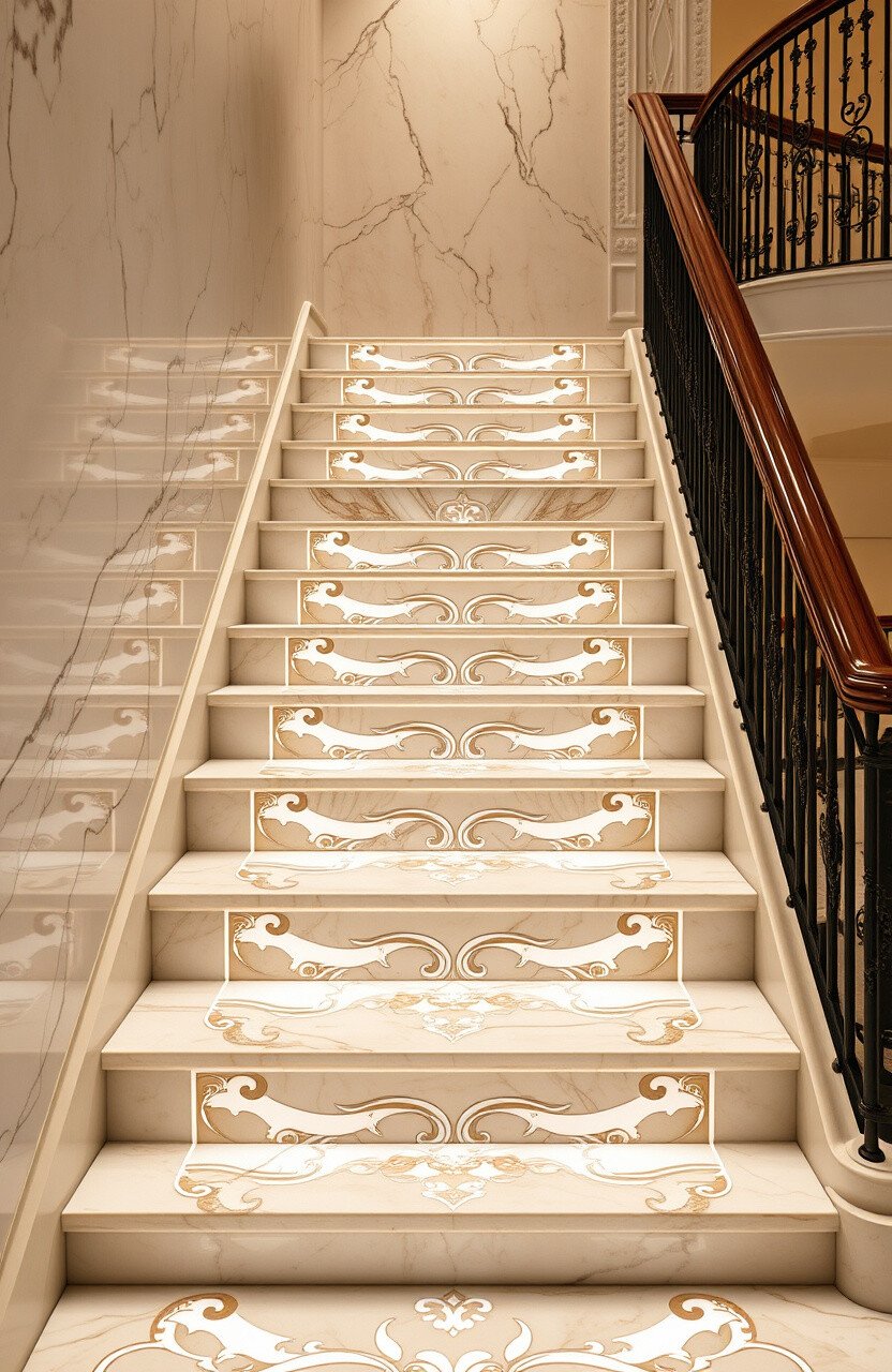 Imagine a staircase crafted from patterned marble, illuminated by custom LED designs. Each step tells its own story through intricate lighting patterns.