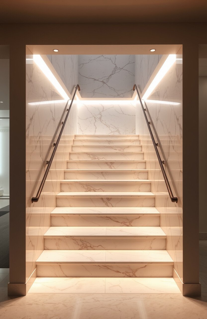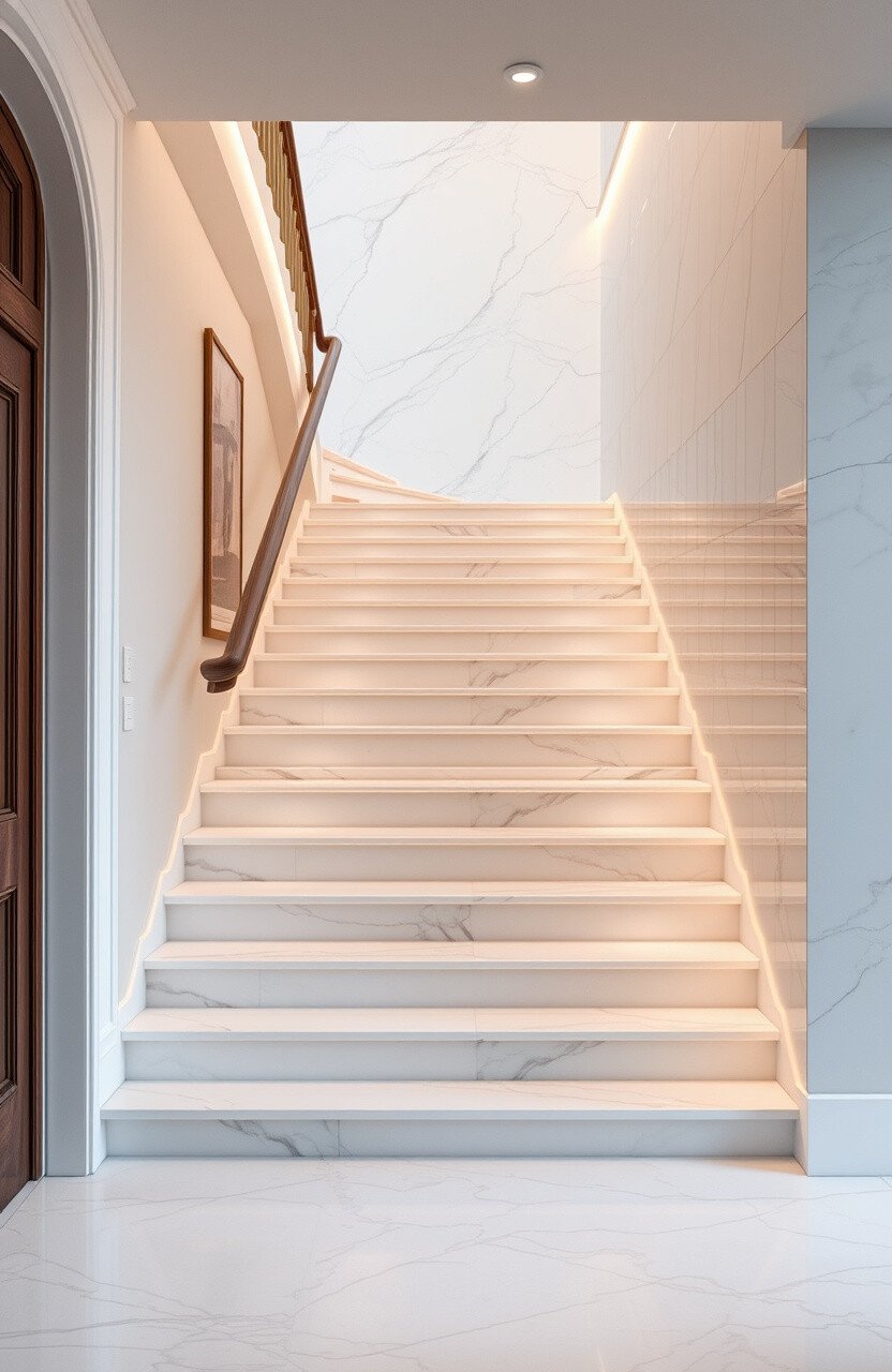 Imagine a marble staircase with LED cove lighting, casting a soft glow from above. The lights create a warm and inviting atmosphere.