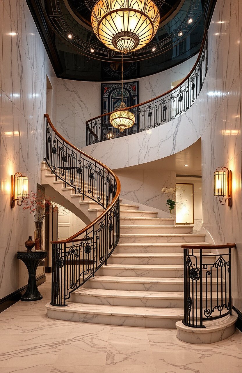 A chandelier suspended over your marble staircase can add a touch of grandeur and elegance. It acts as a focal point, drawing eyes upward and creating a luxurious feel.