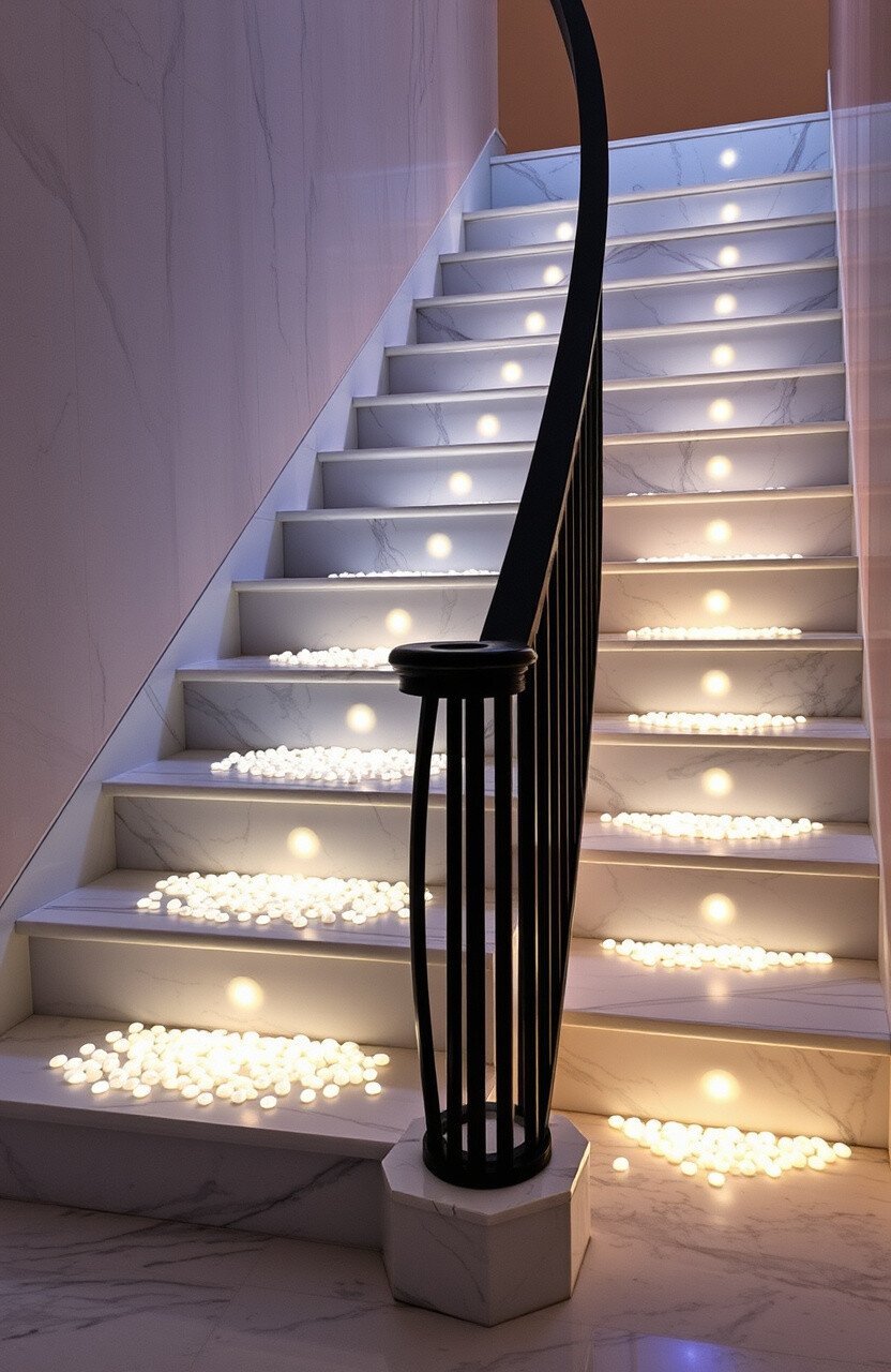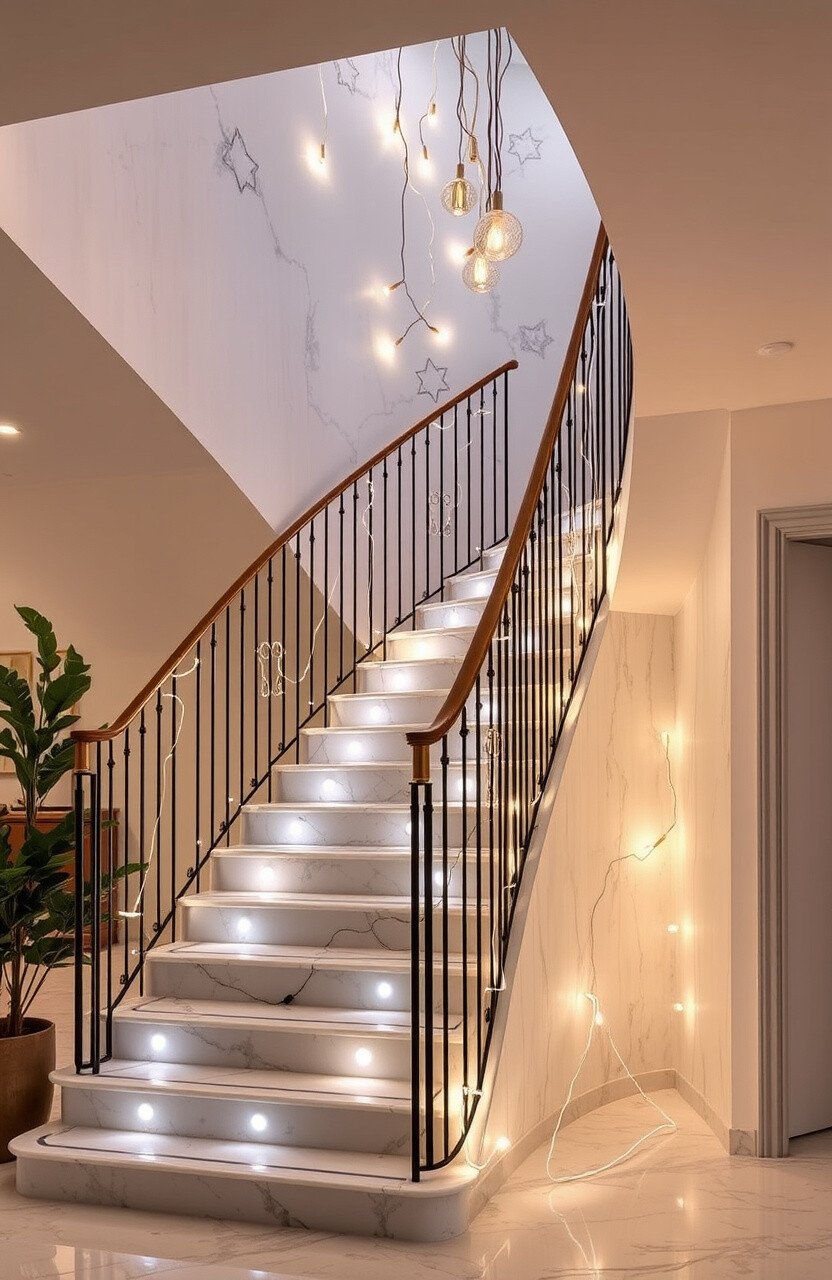 Twinkling star lights can create a dreamy atmosphere on your marble staircase. These lights mimic a starlit sky, making each step feel like a journey through the cosmos.