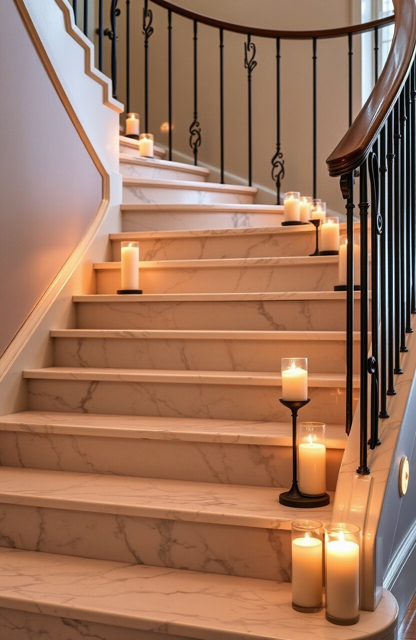 Candle holders on your marble staircase create a warm and inviting atmosphere. They add a touch of romance and elegance with their soft, flickering light.