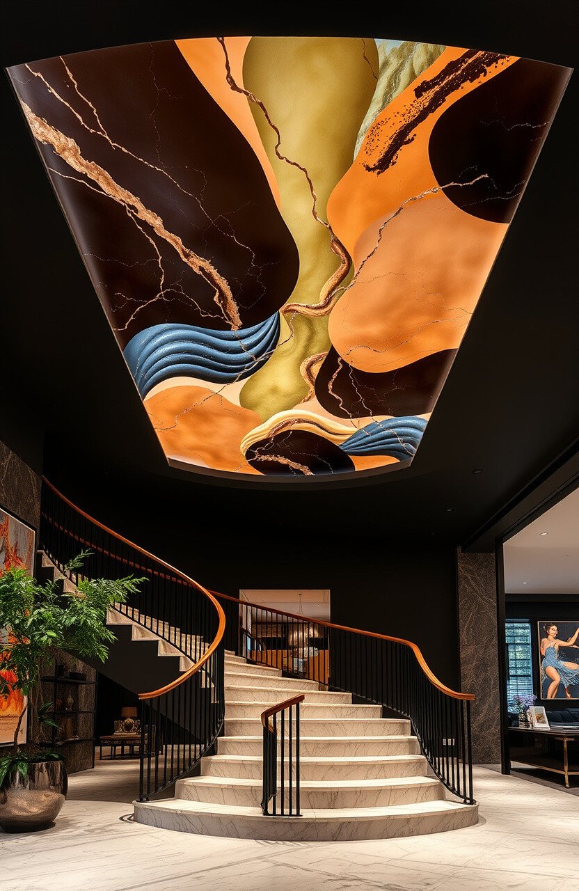 Artistic ceiling installations can turn your marble staircase into a gallery space. They offer a creative and eye-catching design that doubles as an art piece.