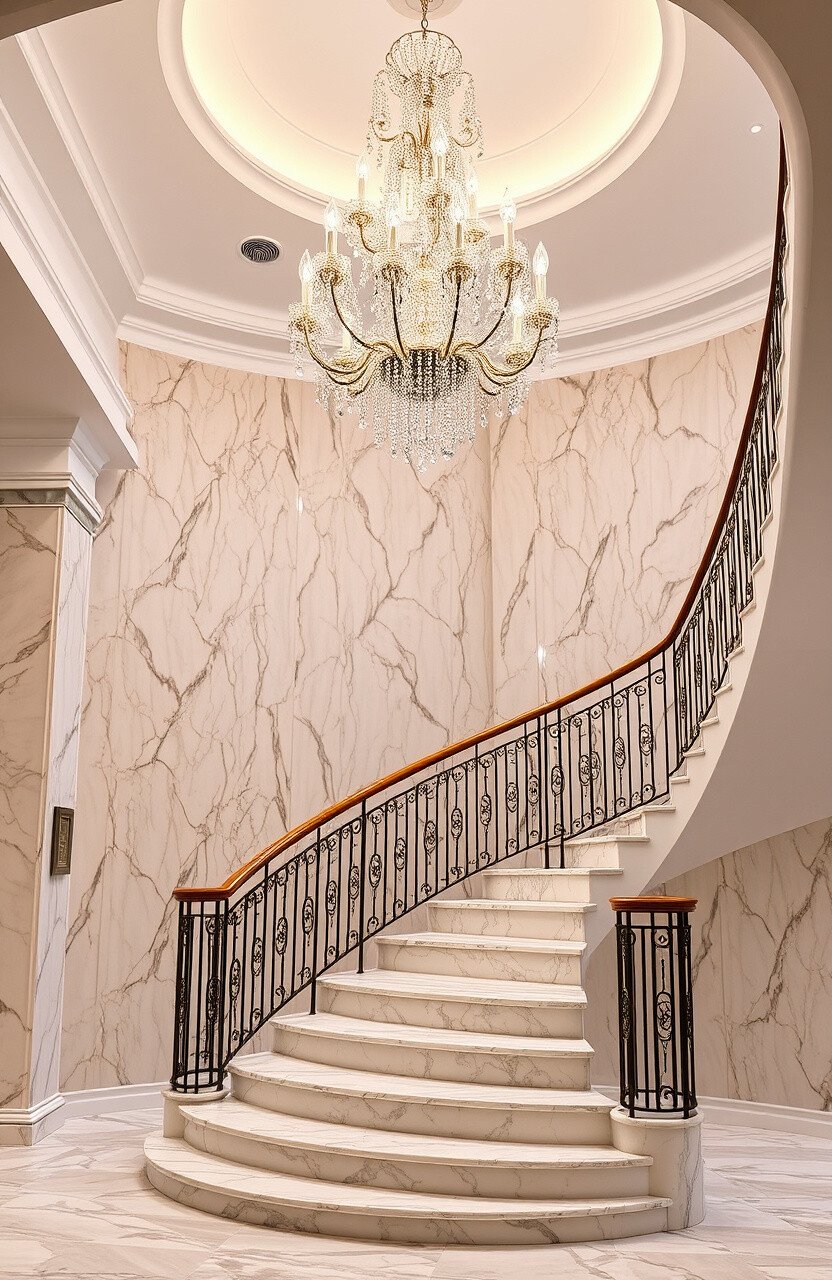 Elegant crystal chandeliers can bring a touch of luxury and sophistication to your marble staircase. Their sparkling design and classic appeal create a stunning focal point.