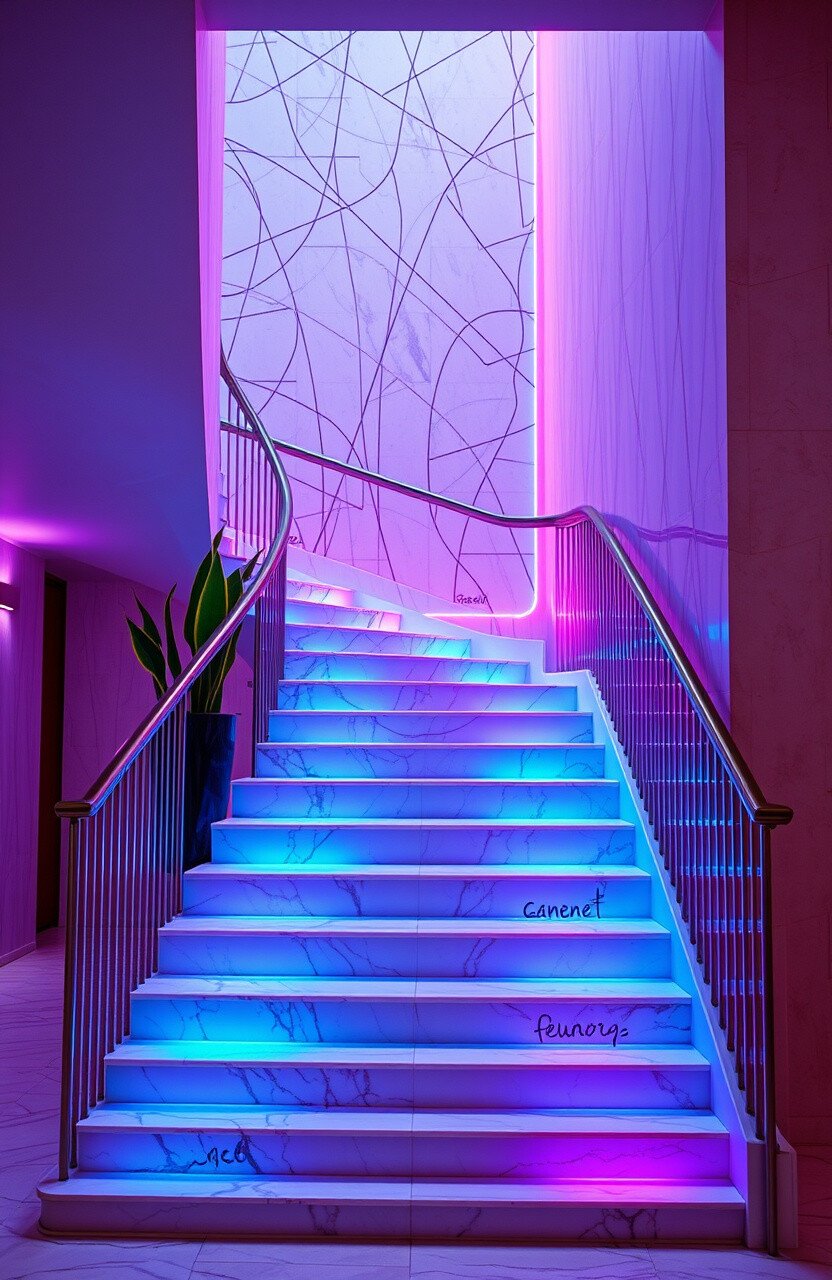 Neon lights can bring a bold and vibrant feel to your marble staircase. They offer a pop of color and a touch of retro fun.