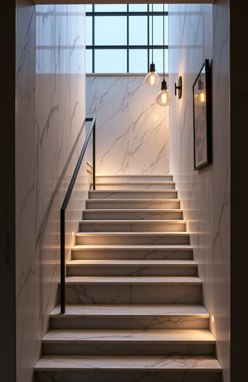 Industrial lights can give your marble staircase a modern, edgy vibe. They offer a raw and rugged appeal that contrasts beautifully with sleek marble.