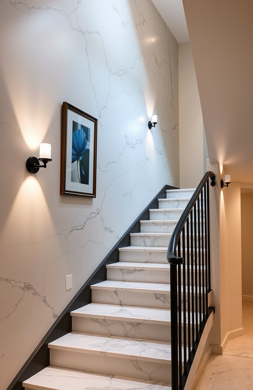 Lighted art installations can turn your marble staircase into a gallery space. They offer a creative and eye-catching design that doubles as an art piece.