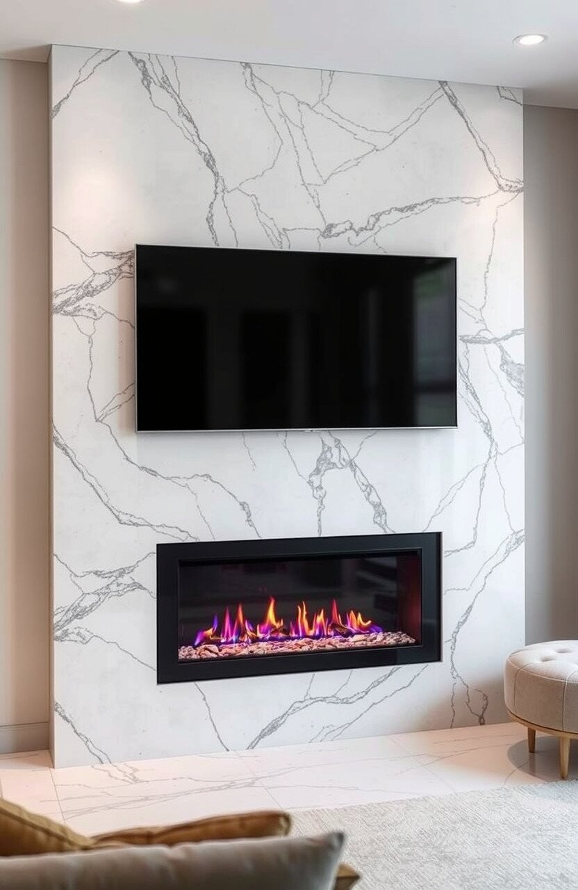 White marble is timeless and adds a touch of elegance. Pairing it with a sleek electric fireplace creates a clean and modern look.