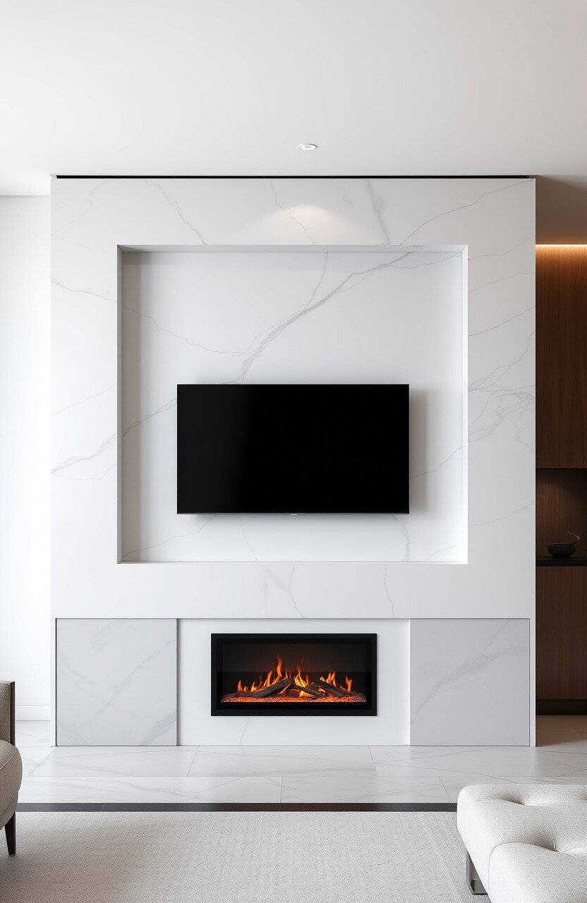 A minimalist marble TV wall with a simple electric fireplace is perfect for lovers of clean lines and uncluttered spaces.