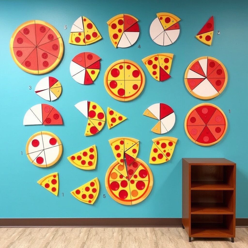 Imagine a wall decorated like a pizza parlor, with different pizza slices representing fractions. From half to a quarter to an eighth, each slice can be a different topping and color. This yummy decor idea helps kids understand fractions in a fun, relatable way.