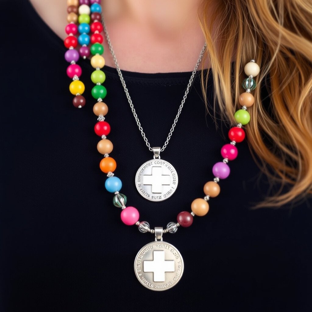 For a pop of color, beaded necklaces are a fun choice. Picture a string of vibrant beads, each one resonating with your personality, while discreetly holding your medical info. These necklaces add a playful twist to your outfit.