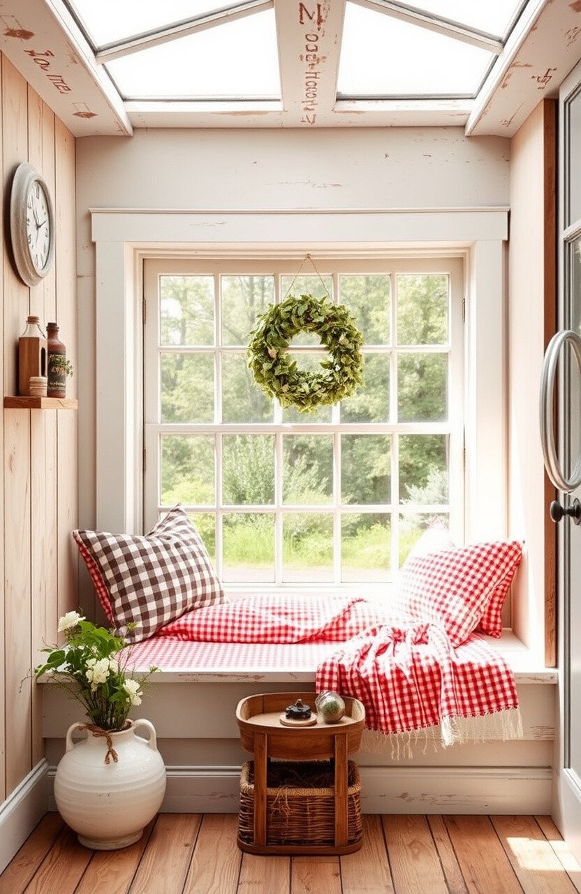 Capture the essence of a cozy farmhouse with a nook featuring distressed wood, gingham prints, and vintage accents.