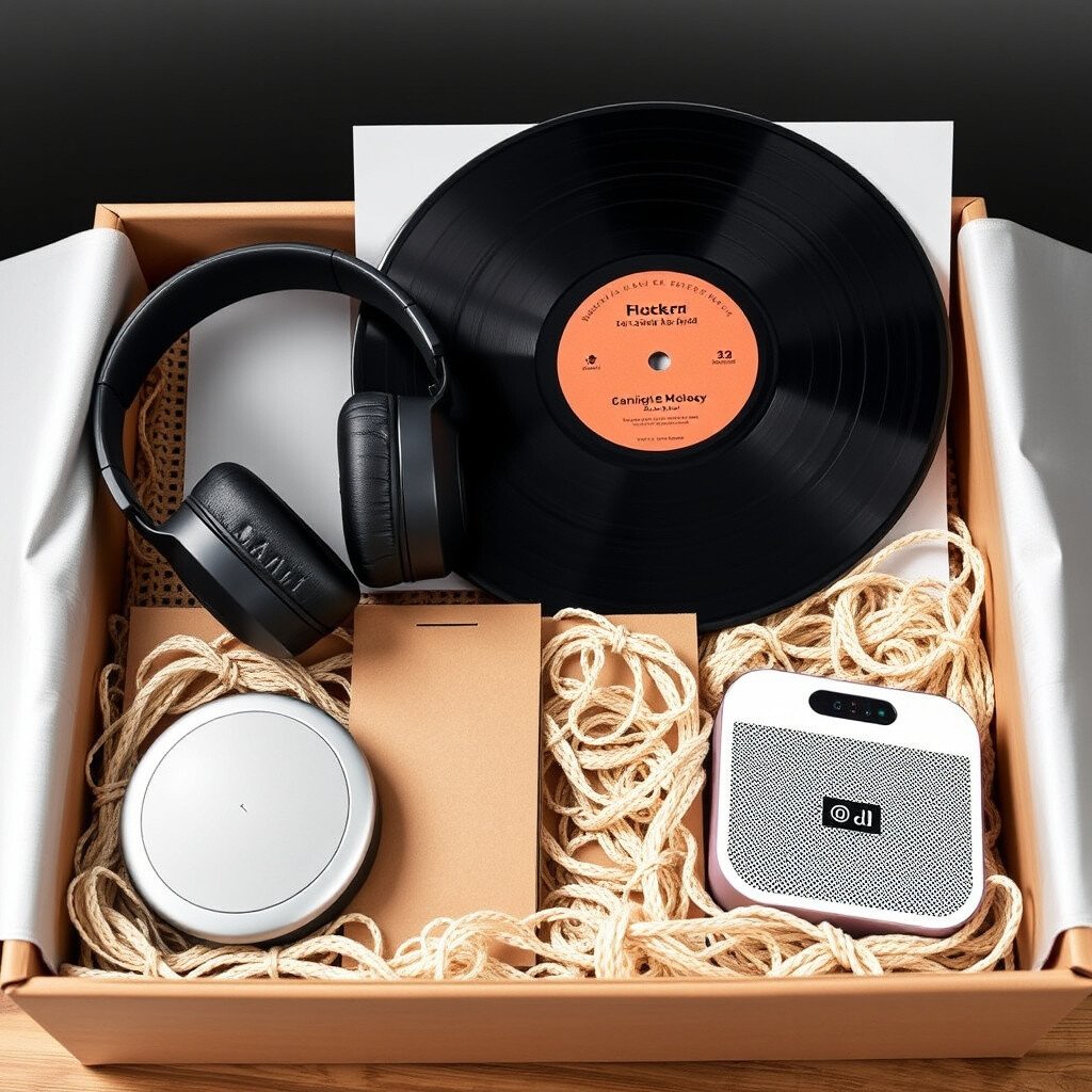 For those who move to the rhythm of their favorite tunes, this gift box is a hit. It includes a pair of sleek headphones, a vinyl record, and a portable speaker.