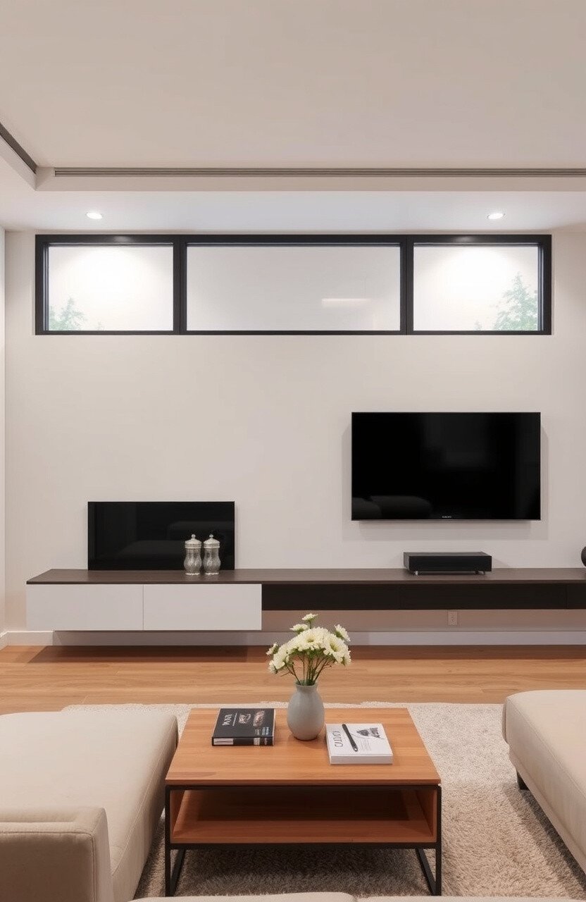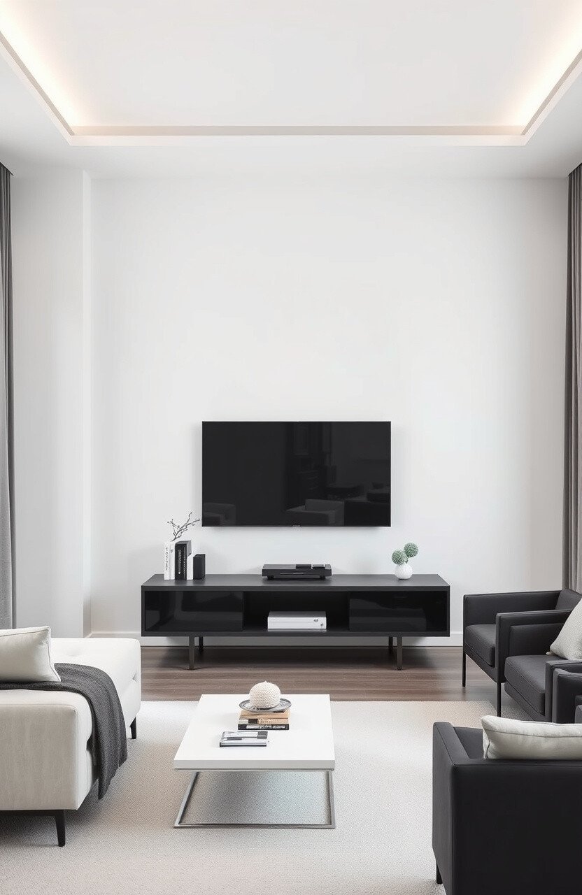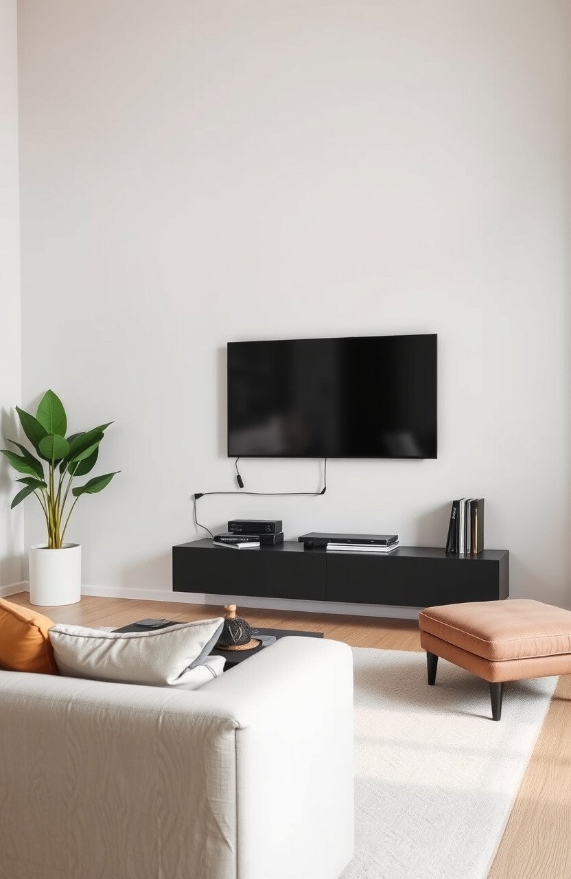 Use minimal furniture like a simple console table to complement your TV. It keeps the focus on the screen.