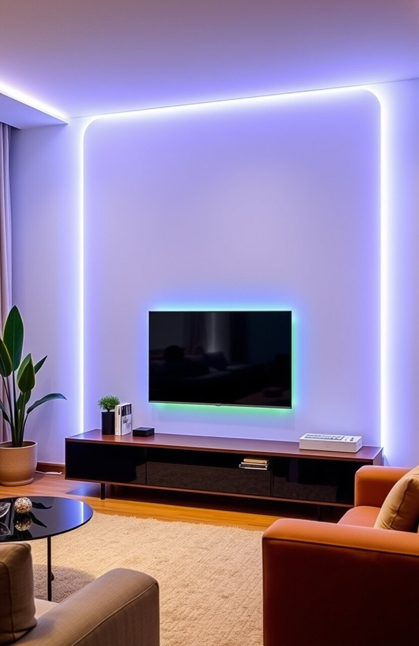 LED light strips behind the TV create a cozy glow. Choose colors that match your mood or the season.