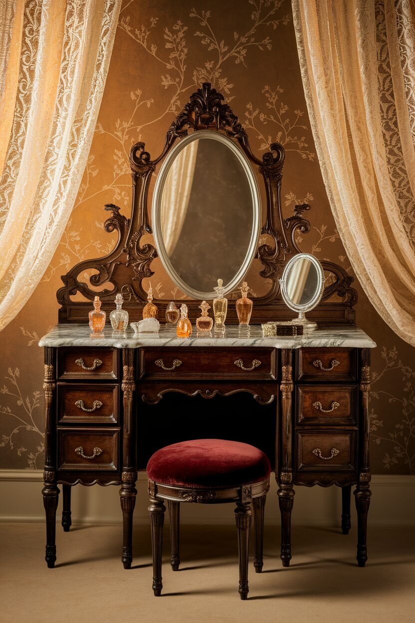 These pieces often feature intricate carvings, soft pastel colors, and elegant handles that make them stand out. Pair them with a vintage mirror for an extra touch of charm!