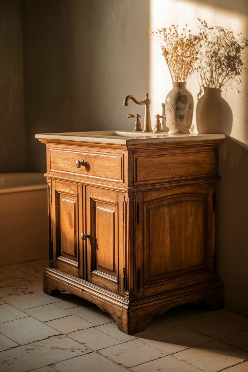 Adding a rustic wood vanity can also be a great way to personalize your space. You can easily complement it with vintage mirrors and accessories for a complete look.