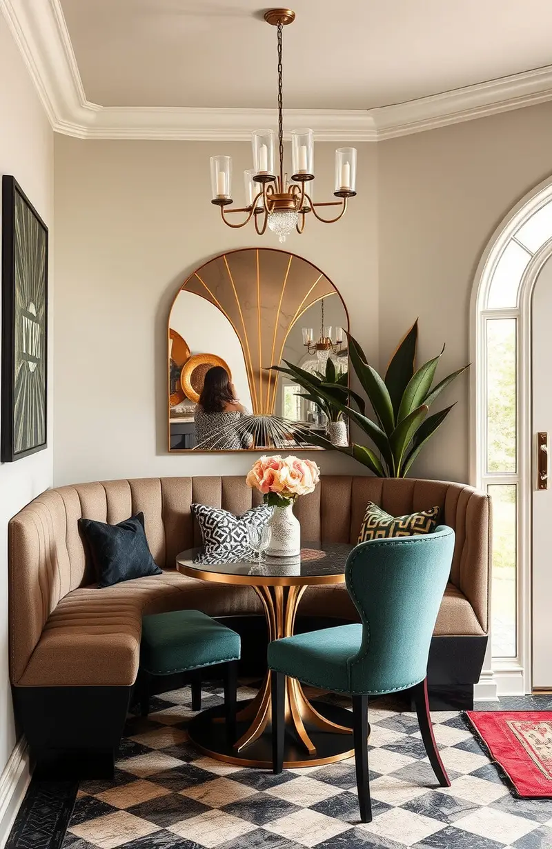 Bring the glamour of the 1920s to your breakfast nook with art deco design. It’s all about bold geometry, luxurious materials, and rich colors.