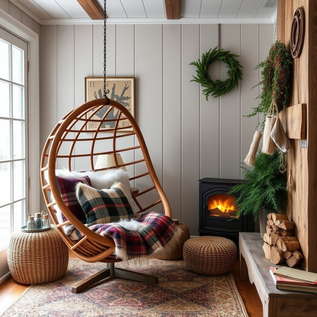 Bring the coziness of a cabin into your home with a rustic egg chair. Look for one made of wood with plaid or fur cushions. Add a small fireplace or a stack of firewood nearby.
