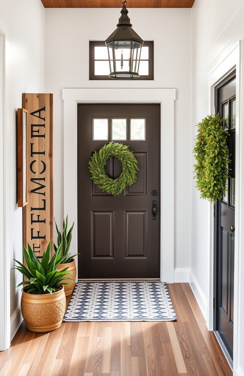 Potted plants bring life and color to your entryway. Choose hardy varieties that thrive in indirect light, like ferns or snake plants.