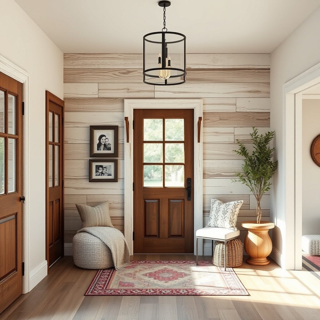 Embrace the warmth of a rustic farmhouse foyer with distressed wood and cozy textiles.