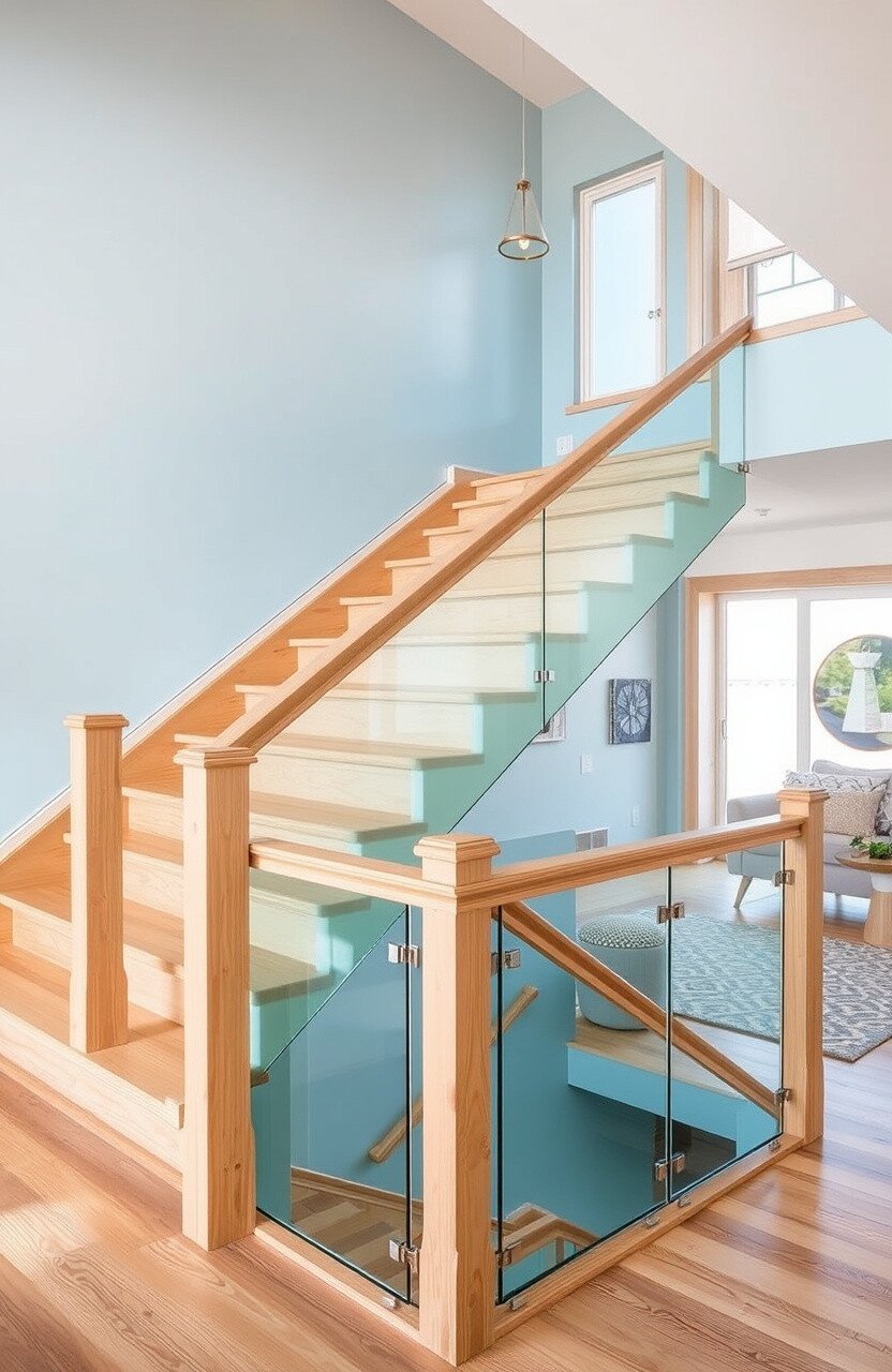 Choose a color that complements your home’s palette and use it for the glass panels. Keep the rest of the staircase neutral.