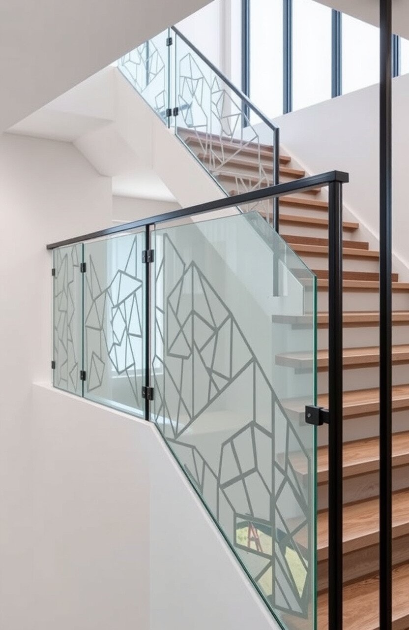 Use glass panels with abstract designs. Pair with minimalist décor to let the railing shine.