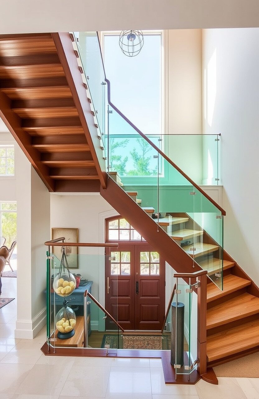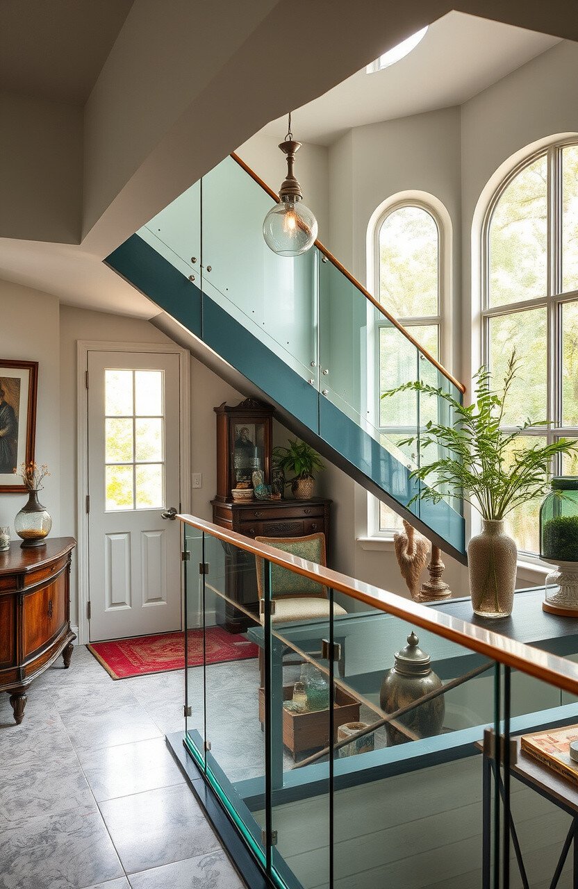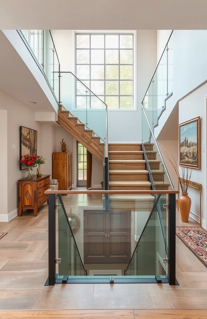 Combine glass with cozy elements. They’re like a warm hug for your stairs.