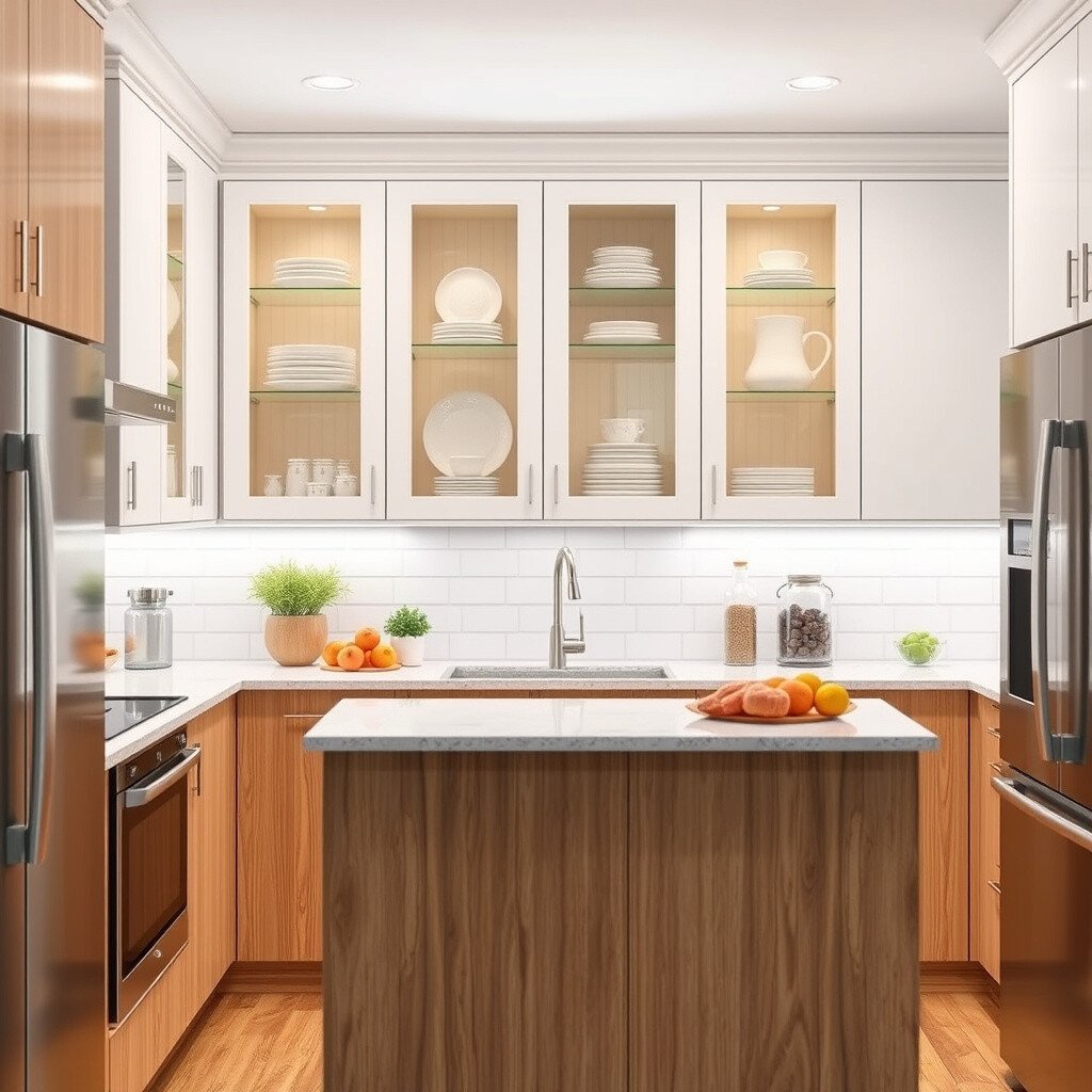 Swap solid cabinet doors for glass to lighten up your kitchen. It gives an open and airy feel.