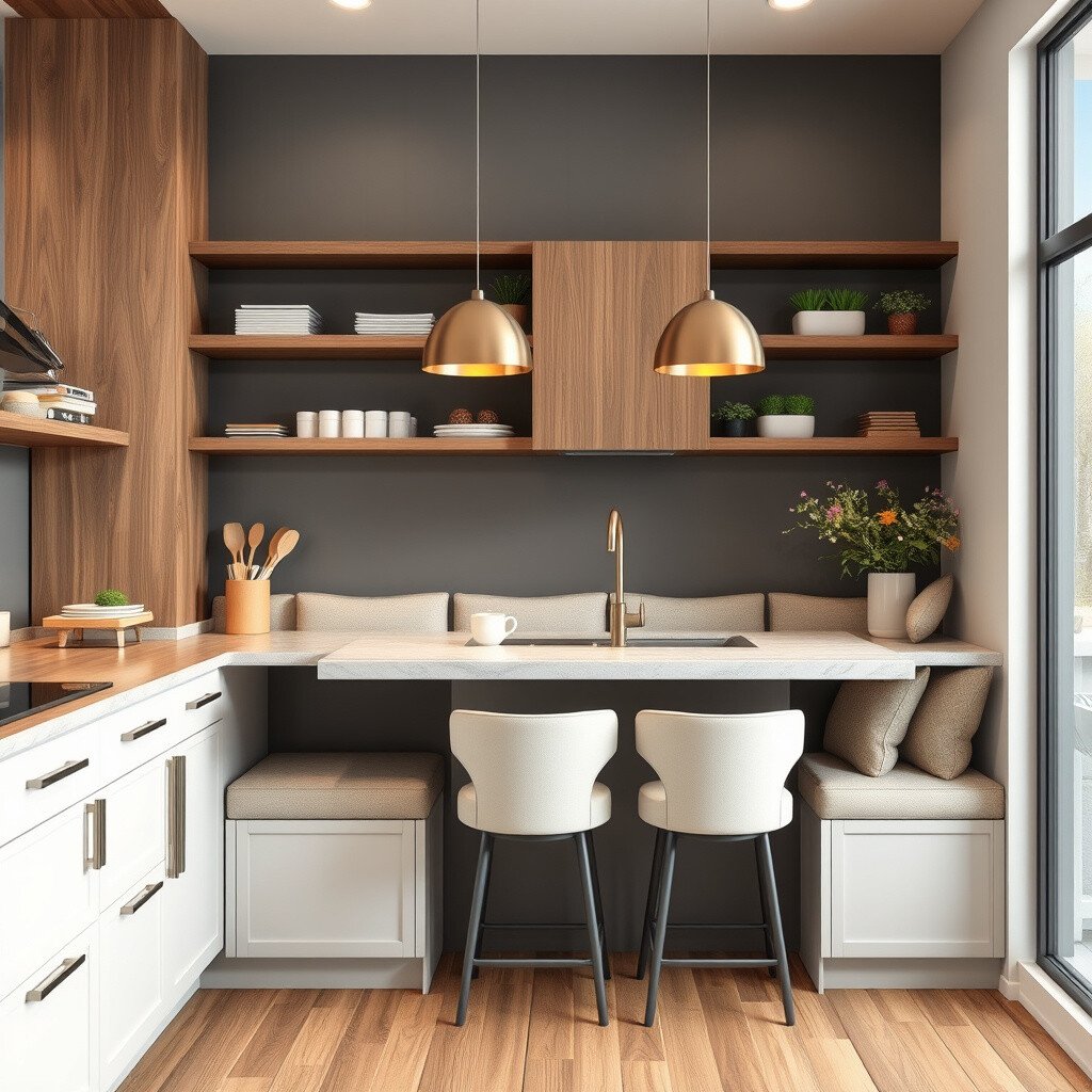 Maximize space with integrated seating, like built-in benches or stools under the counter. It’s practical and stylish.