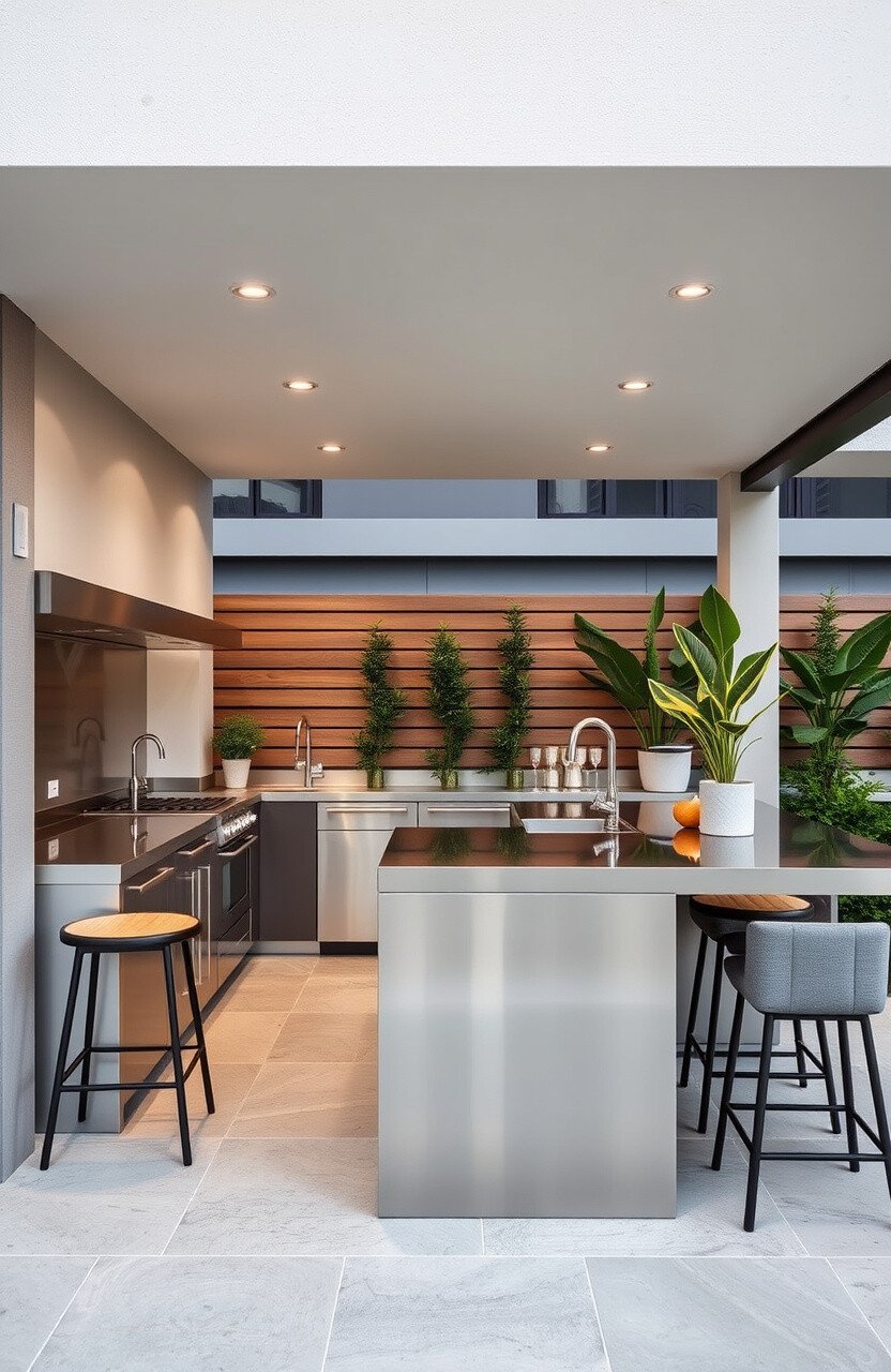 Imagine smooth lines and shiny surfaces. A modern outdoor kitchen is all about simplicity and style. Stainless steel countertops and bar stools create a chic, urban vibe.
