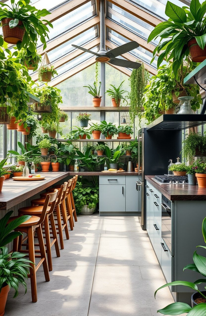 Imagine cooking surrounded by lush plants. A greenhouse kitchen is fresh and vibrant. Wooden bar stools and glass decor bring nature indoors.