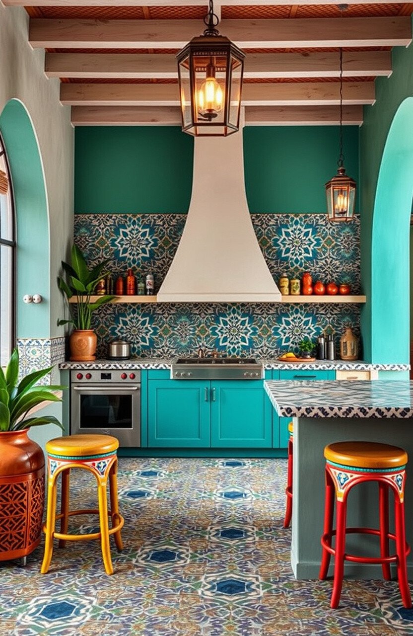 Think vibrant colors and intricate patterns. A Moroccan kitchen is exotic and lively. Mosaic tiles and colorful bar stools create a feast for the eyes.