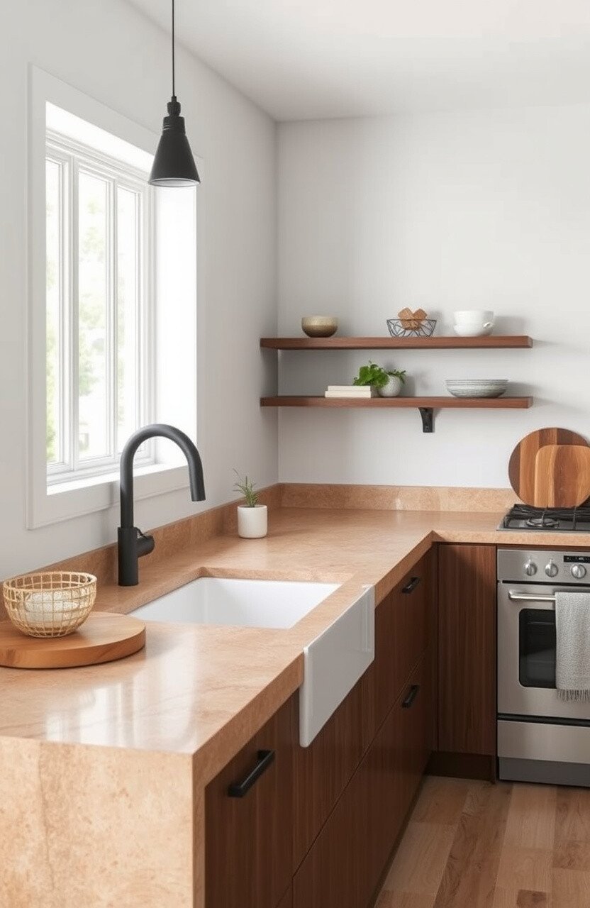 Warm walnut countertops offer a rich, inviting look with their unique grain patterns and deep colors. They’re perfect for adding a touch of nature to minimalist spaces.