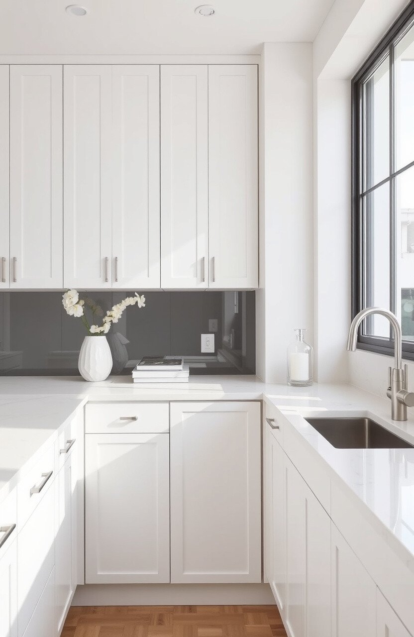 Consider different materials for unique white finishes. Pair with simple cabinetry for a cohesive design.