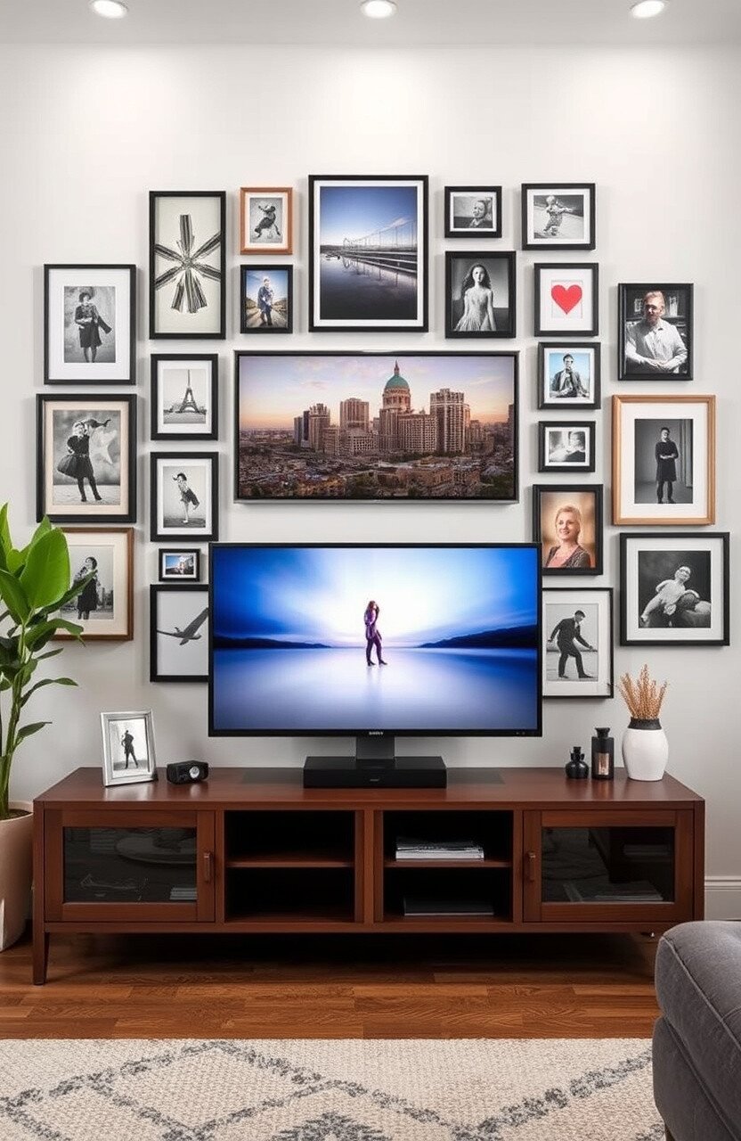 Turn your TV wall into a stunning gallery. Surround your TV with a mix of art frames, family photos, and quirky prints.