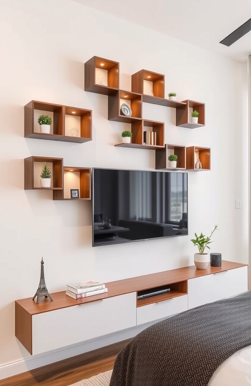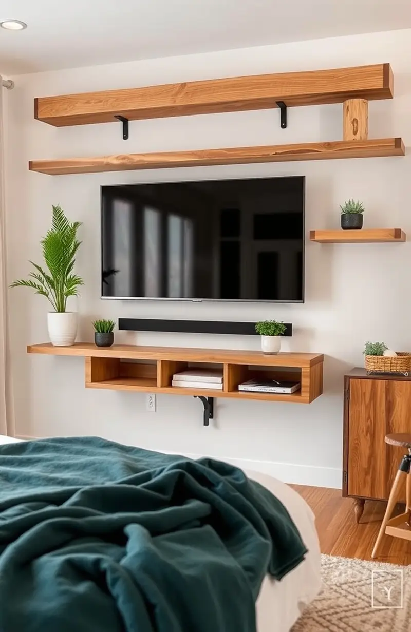 If you love clean lines and open spaces, floating minimalist shelves might be your perfect match. These shelves create an airy feel, letting your TV take center stage without any distractions.