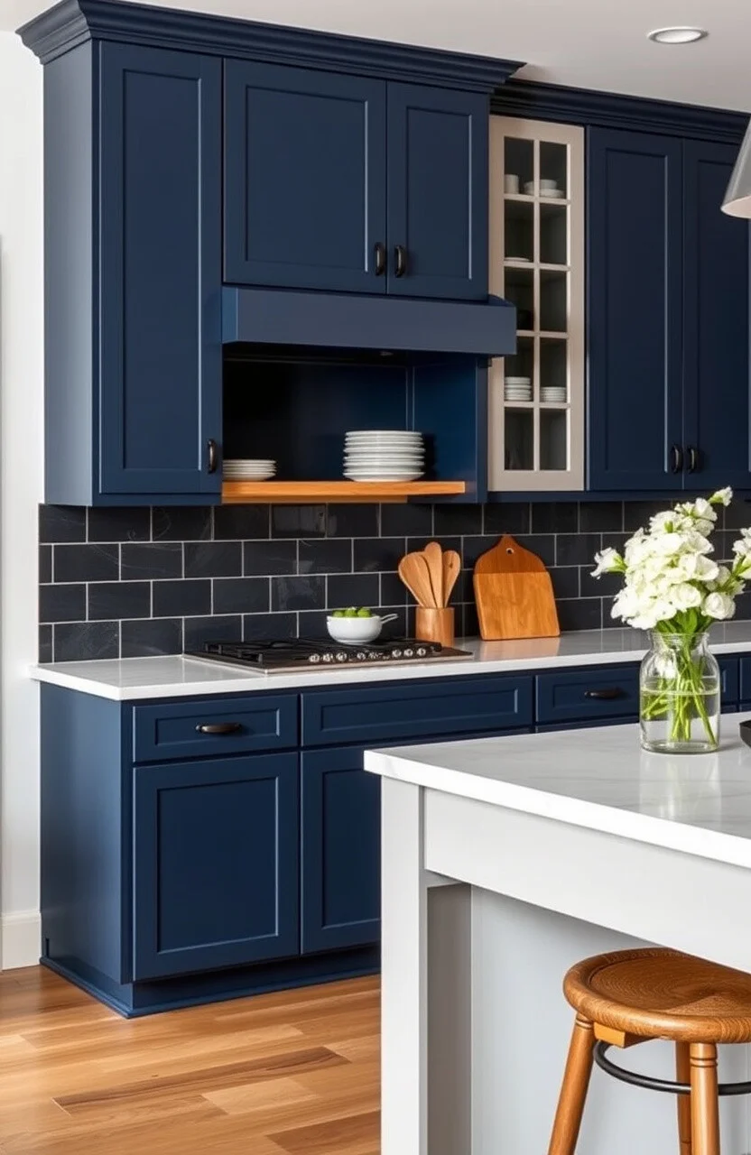 For added charm, use a patterned tile backsplash. It complements the navy blue and adds visual interest to the room.