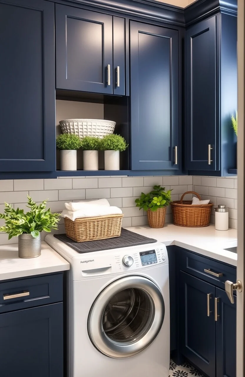 Turn your laundry room into a stylish and functional space with navy blue cabinets. They add a pop of color to an otherwise utilitarian area.