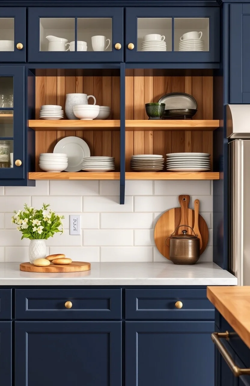 5. Open Shelving with Navy Blue Cabinets
